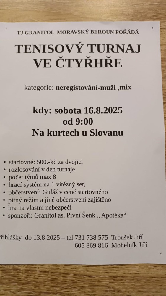 V Sobotu 16.8.2025 od 9.00hod. se koná tenisový turnaj ve čtyřhře na antukových dvorcích u "SLOVANU". Tímto zveme milovníky tenisu, aby přišli povzbudit místní borce. Občerstvení zajištěno:)
